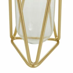- These gold/black and transparent vases for decor feature striking cylinder glass vases with round bottoms and metal frames with geometric patterns