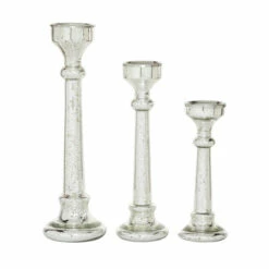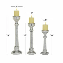 Infuse your space in the romantic candlelight glow that emits from this vintage decorative tapered candle holder set for home. Delight your guests and make any occasion extra special by adding a lighted or flameless candle to this candle holder centerpiece. Made with a sturdy base, it is perfect for creating an elegant atmosphere at your table top or mantel. This item comes shipped in one carton. Suitable for indoor use only. Made in India. This is a three-piece candle holder set from India. Vintage inspired. Each tapered style pillar candle holder can accommodate 1 pillar candle.