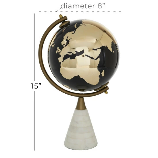 - This modern style round globe comes in black orb with gold continents and axis along with white base