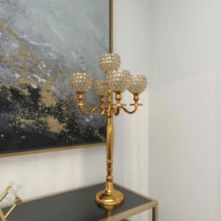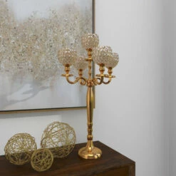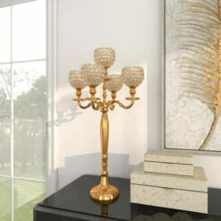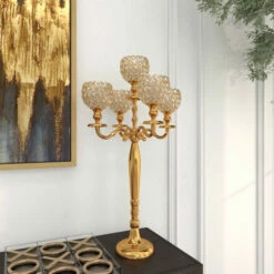 Delight your guests and make any occasion extra special by adding a lighted or flameless candle to this hurricane lamp centerpiece. Made with a sturdy base, it is perfect for creating an elegant atmosphere at your table top or mantel. Display as accent or centerpiece décor on your console, coffee, or dining table. Designed with black rubber stoppers at the base that prevent scratching furniture and table tops, as well as sliding around. This item ships in 1 carton. Suitable for indoor use only. Made in India. Glam Design. Candelabra candle holder which can hold 5 small pillar candle.