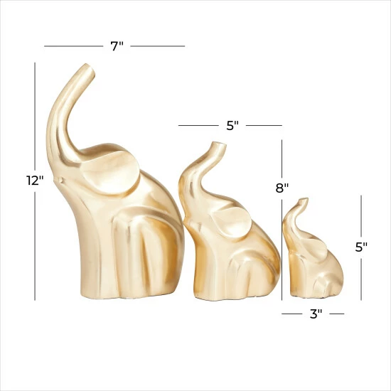 This elephant sculpture set is bound to impress your guests with its stunning design and the optimistic atmosphere it provides. This item will elevate any living space and bring some dimensions and texture to your surface space. An artistic display to showcase your personality and enhance the look in any room. Designed with black stoppers at the base that prevent sliding around as well as scratching the floor. This item comes shipped in one carton. The aluminum material of this pieces is molded to form elephant-inspired sculptures with smooth texture. Suitable for indoor use only. Made in India. Each set comes with 3 elephant sculptures. Glam Style. Aluminum sculpture makes a great gift for any occasion.