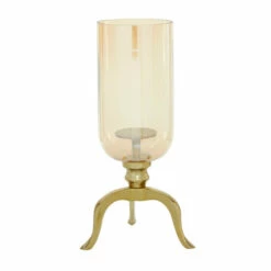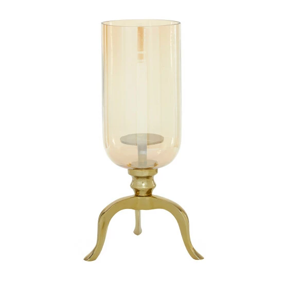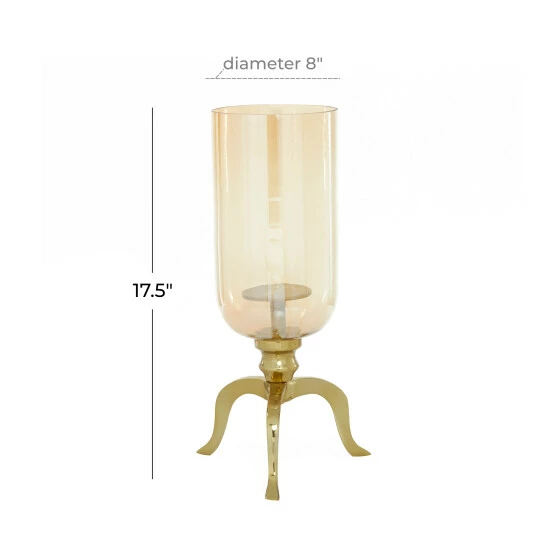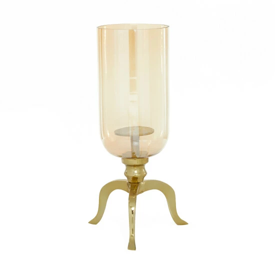 - This candle holder features luster glass with light bronze undertone and gold shine finish