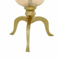 - Glass candle holder is mounted on serpentine tripod aluminum base