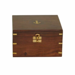 - Nautical heirloom decor featuring a detailed gold sextant instrument replica with frame, telescope, magnifying glass, and shade glasses along with a brown square rosewood box with a gold latch lock and an anchor logo on top
