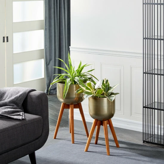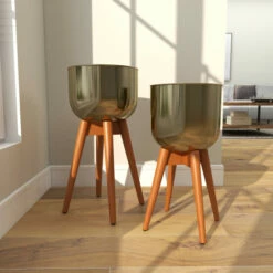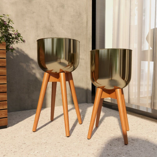 Leverage on the variation in pot size and depth and stand height of this 2-in-1 set of round indoor planters for contemporary or modern interior designing. The simplicity of the exteriors can match with dim color palettes, muted patterns, and less tactile textures. Wooden stands and no-drainage hole iron pots make up the solid construction to not disturb the calmness in a corner of your living space. Planter heights are 24″ and 21″. Use as plant holders or corner accent pieces in modern or contemporary interiors. Wipe clean with a dry cloth. Planters have four wooden legs. Suitable for indoor and outdoor use Pots do not have drainage holes. These gold planters come as a set of two. Modern design. This item comes shipped in one carton. Planters do not have drainage holes but they are not watertight.