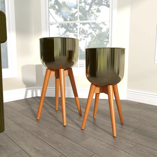 - This set comes with planters in varying heights highlighting round metal pots with 4-legged wooden bases
