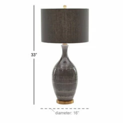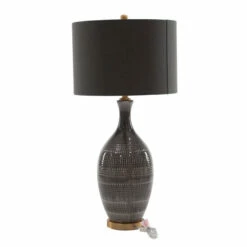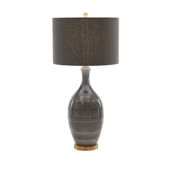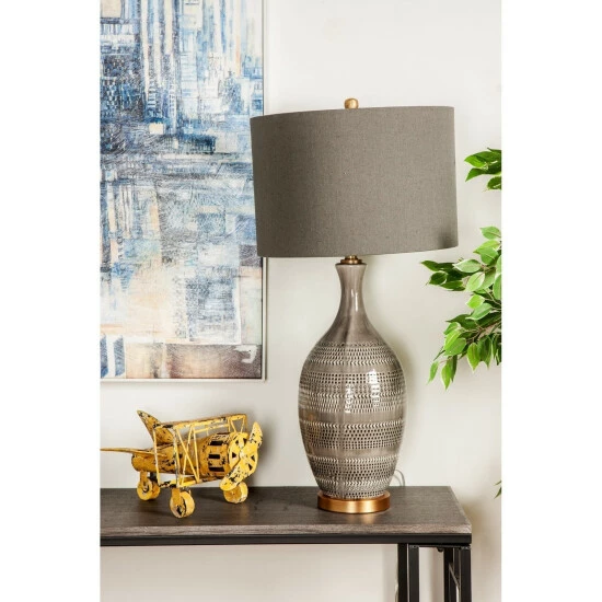 Bring a touch of contemporary glamour to your living room or bedroom with this stunning table lamp from Studio 350. It features a cylindrical black linen shade, a round gold iron finial, a tapered gray earthenware body adorned with pierced circular patterns, and a flat round gold iron base. Place it in light-themed spaces for a welcoming contrast, near sofas or chairs for task lighting, or in room corners for a dramatic and relaxing glow. Get this table lamp now at a price that won’t hurt your pocket!