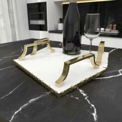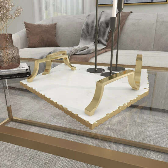 Give organizing and decorating a hint of sparkle with these glam-themed trays as centerpiece or accent organizers on your tables. Whether in your kitchen, or on your coffee table, it’s a great way to display and store your favorite things. A storage piece that is spacious for your trinkets or decorative goods on your mantle, coffee table or kitchen counter. This item comes shipped in one carton. Suitable for indoor use only. Made in India. Set of 2 marble and aluminum serving trays. Glam theme.