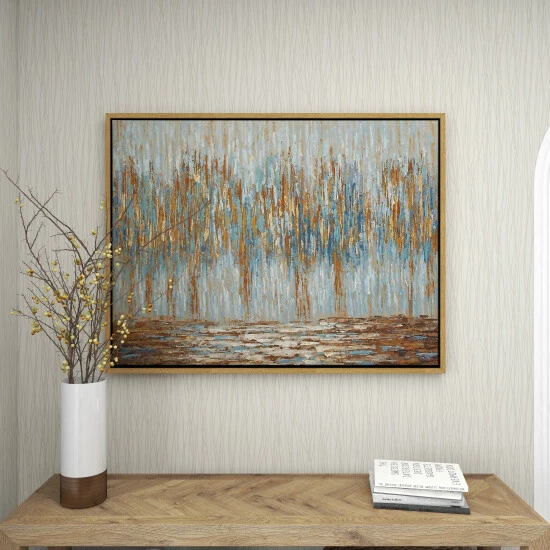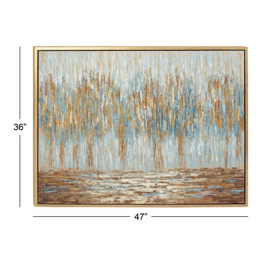 - Canvas framed art wall decor comes in a gold finish with a natural brown Chinese fir wood frame