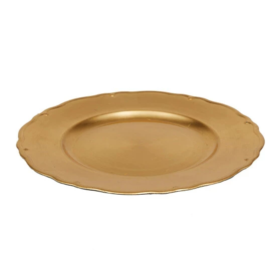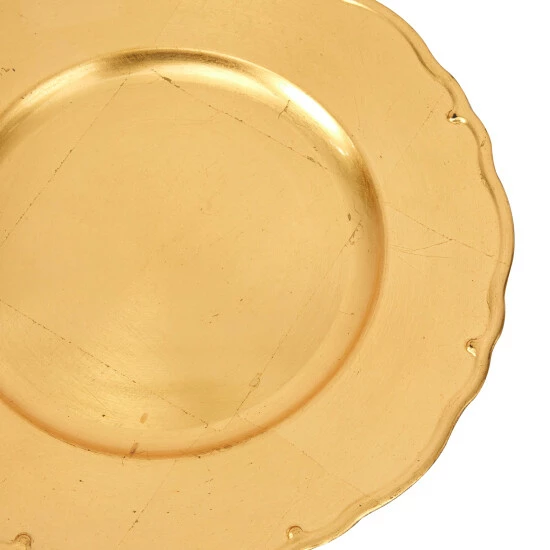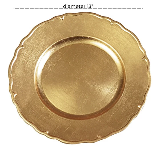 Delight your guests and wow them with this unique charger display. Made with a sturdy base, it is perfect for creating an elegant atmosphere at your table top or mantel. Provides an elegant and practical way to serve salad plates, soup bowls, and entrees. This item ships in 1 carton. Please note that this item is for decorative purpose only and is not food safe. Suitable for indoor use only. This gold decorative plate come in a set of 11. Glam Design.