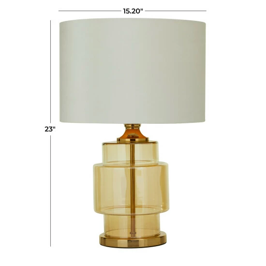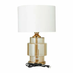 - A glam table lamp featuring a white drum-shaped shade mounted on an gold round body with a layered design and a circular metal base