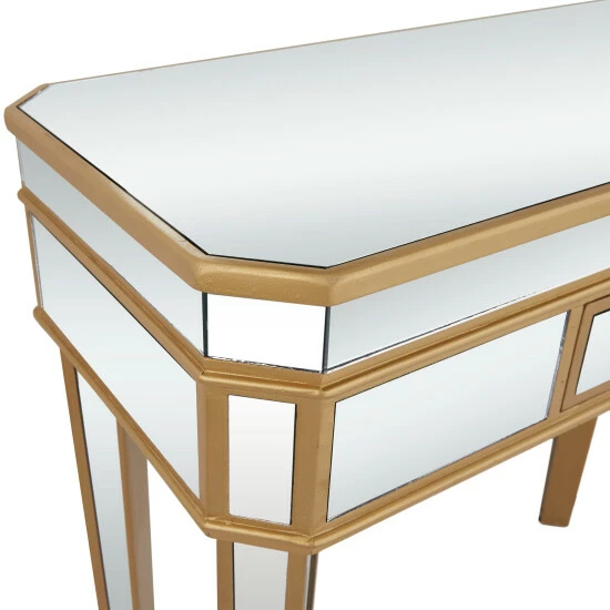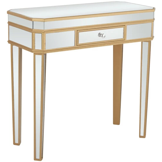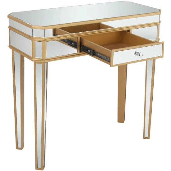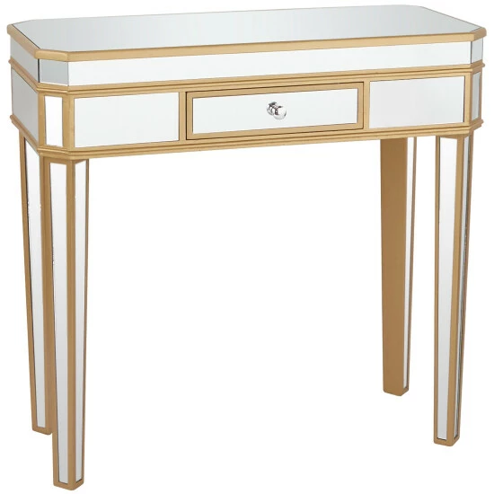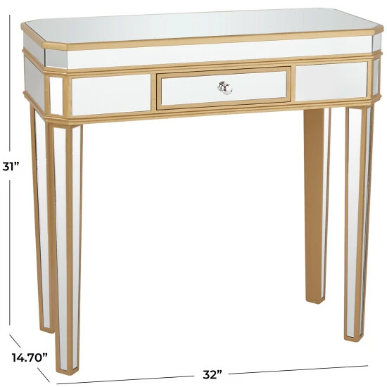 - Features a gold console table with reflective glass panels and a spacious drawer with clear knob handle