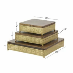 - Set of three 13″, 15″ and 20″ New Traditional metal and wood tray, features square fir wood trays, smooth and stained top, gold-finished thick tin bands, floral details with metal feet