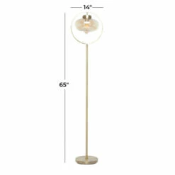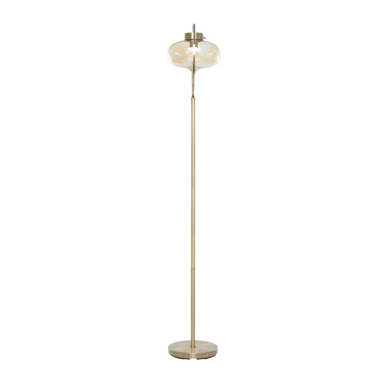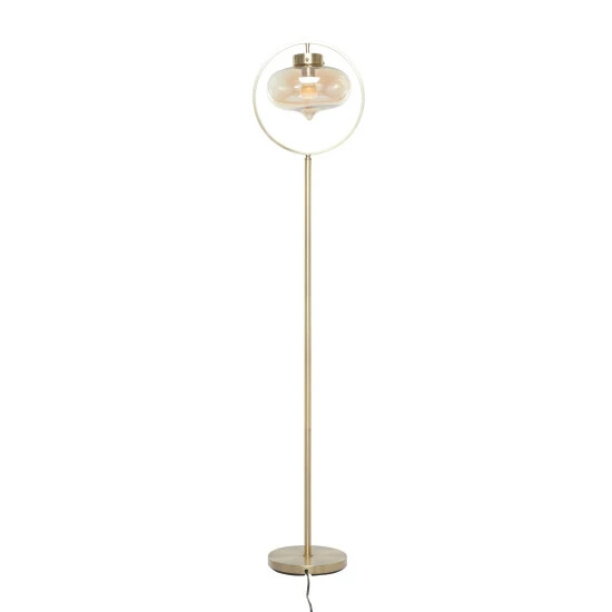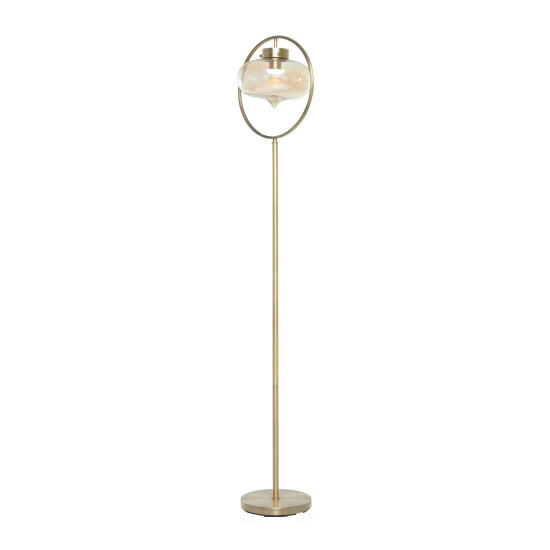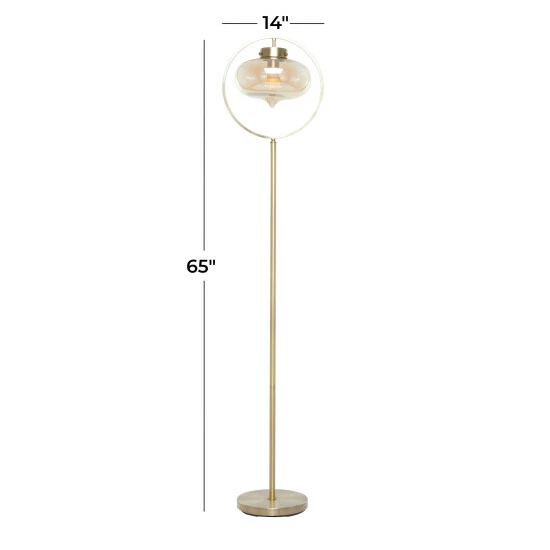 Illuminate your living room or bedroom with this gold floor lamp and add a sleek and refined touch to your contemporary home corners. Brighten up any room to create a warming atmosphere for you and your guests with this chic floor lamp. Add height and depth into your open floor space with this expertly designed floor lamp. Designed with black rubber stoppers at the base that prevent scratching as well as sliding around. This item comes shipped in one carton. Glass shade is bolted to round metal frame for sturdy support. Suitable for indoor use only. Glass shade encloses the lightbulb of this floor lamp. Comes with an on/off button. Contemporary design.. These pieces are designed to offer any contemporary themed home a final touch.. This home decor is crafted with metal and glass for a solid and durable form. This tall floor lamp highlights a metallic gold frame finish with polished high sheen. An oval inverted teardrop faintly tinted glass shade hangs from a round accent top frame giving this floor lamp an eccentric hanging lantern look. This item measures 14″L x 9″W x 65″H and weighs 10 lbs