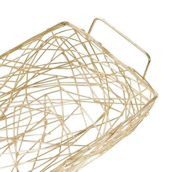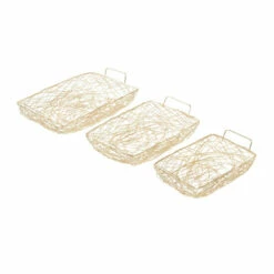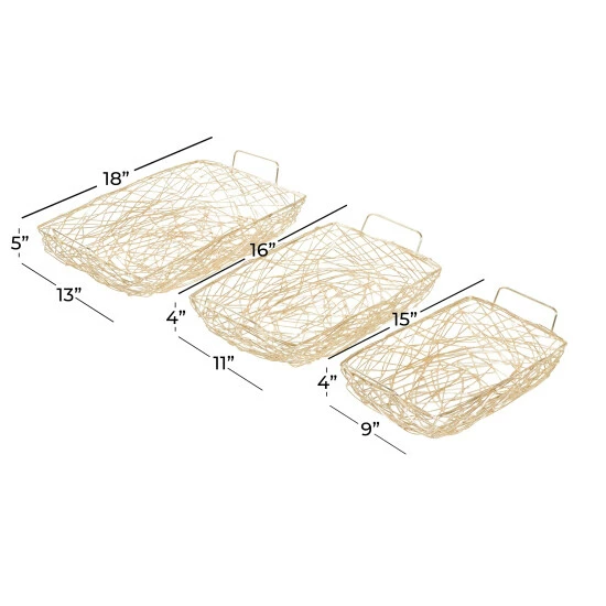The best way to maximize your wall space and add some personality to living space. A glamorous touch with a classic design, best against solid-colored backgrounds in modern or contemporary settings. Each set has 3 nesting trays. Contemporary design. Please note that this item is for decorative purpose use only and are not food safe. This item ships in one carton. Made in India.. Ideal decor that works best in contemporary themed homes. This rectangle tray is made of a solid metal. Features semi matte gold finish. These trays feature handles for easy carry and eye catching design ideal for decorative storage unit on your mantle, console or coffee tables. Each item measures 4.35″ x 14.55″ x 9.35″, 4.15″ x 16.45″ x 11.40″, and 4.60″ x 18.45″ x 13.30″; and collectively weights 7 lbs