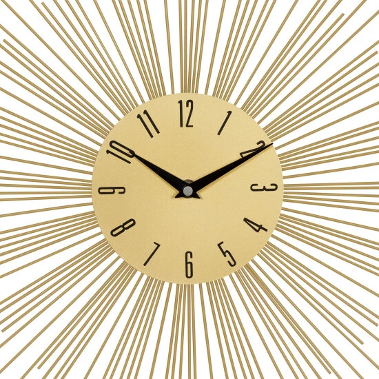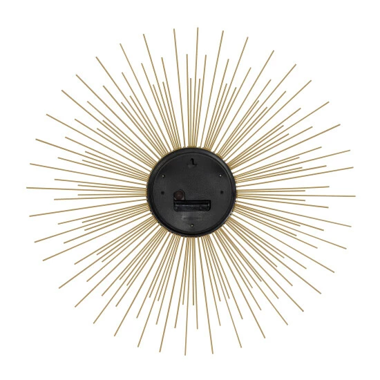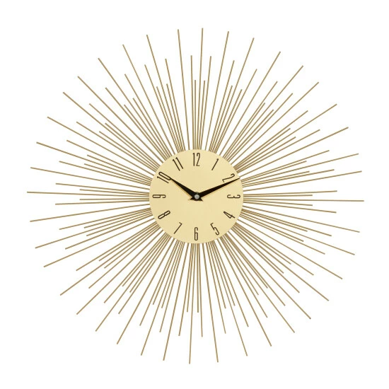 - Polished silver clock face, black hour and minute hands, gold sunburst rays