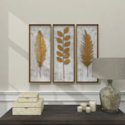 - This gold leaves wall decor set features three vertically oriented leaves used as focal points inside whitewashed rectangular panels.