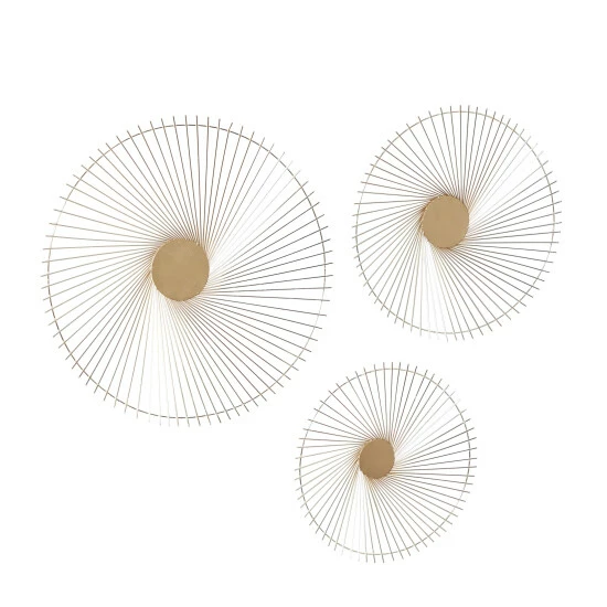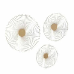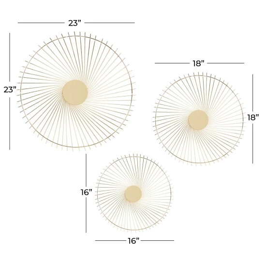 Ideal complement to vanilla-painted walls. Features an elegant look for that bold eclectic-themed style. Create an excellent focal point on your walls paired with some cute accent tables, and level up your home with this amazing wall decor . Each item measures 22.63″ x 22.63″ x 2.50″, 18.00″ x 18.00″ x 2.88″, and 15.50″ x 15.50″ x 2.50″; and collectively weights 2.70 lbs. Suitable for indoor use only. Each set comes with 3 different sized round wall Decor. Easy to hang with nail or screw via loop hardware on the back. This item comes shipped in one carton. Contemporary theme. Made in India.. Crafted in a contemporary style that fits great in most homes. This wall decor set is crafted with 100% metal. Each highlights an overall matte pale gold finish. These wall decor are designed with sun-inspired radiating rays from a round centers. This set measures 3″W x 23″H, 3″W x 18″H, and 3″W x 16″H and weighs 6 lbs