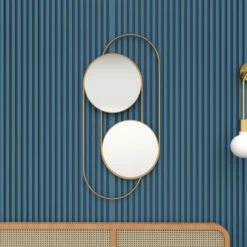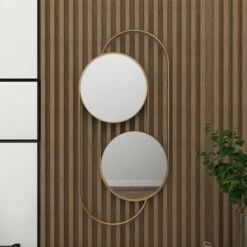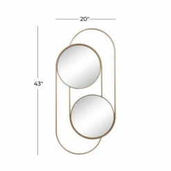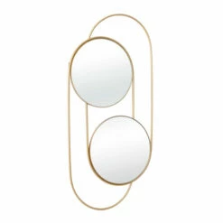 - This wall piece features two round mirrors with a shiny gold loop frame