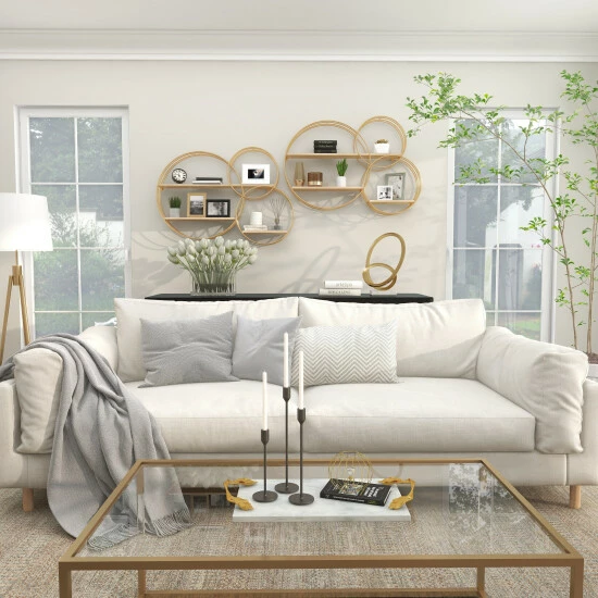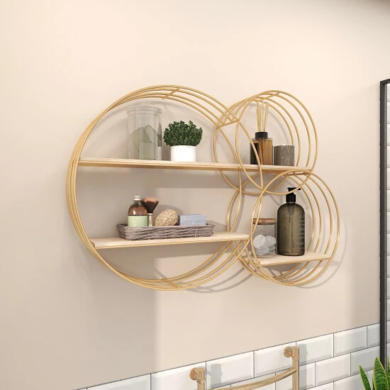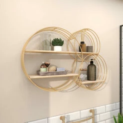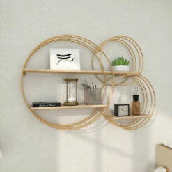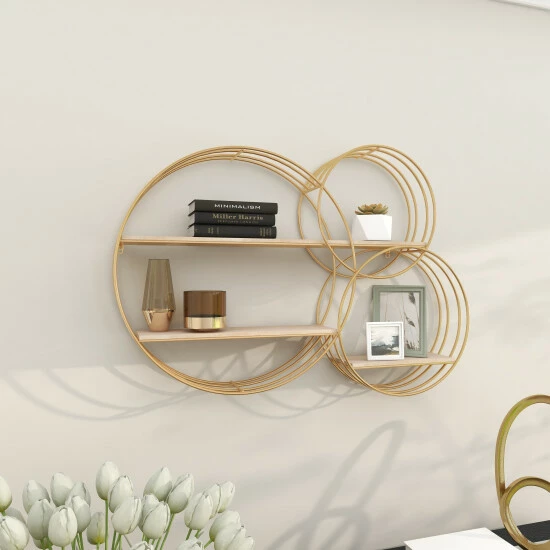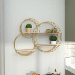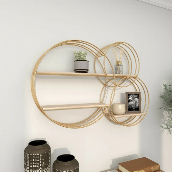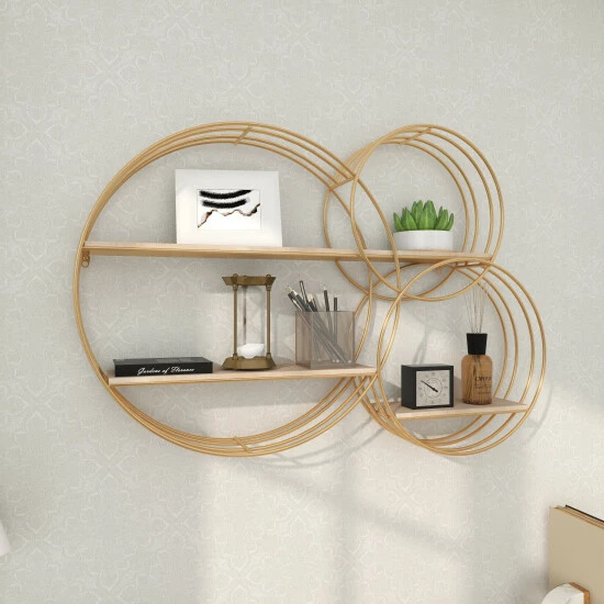 - The wall shelf showcases 3 metal ring frames which are infused for an abstract chic vibe