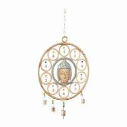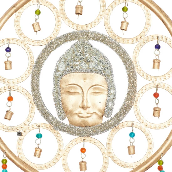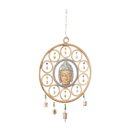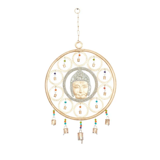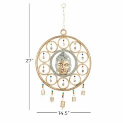 Close your eyes and say goodbye to all your worries as you sit back, relax, and meditate. Now, let the sound of the wind be the focal source of inner peace and overflowing chakra as they slowly drift into your home’s entryway and tall wooden windows with this coastal-inspired, large-sized ‘Smiling Buddha Dreamcatcher’ windchime! This symbolic gold-colored home decor showcases a round ‘dreamcatcher-inspired’ windchime design made of pure iron material and multi-colored glass beads. They are designed with a silver and gold bead-studded ‘Smiling Buddha’ face sculpture in the center and ten embossed iron circles containing one iron windchime and one glass bead each. They are ideal home decorations for entryways, living rooms, balconies, outdoor gardens, and backyard patios. Made in India. This item comes shipped in one carton. Item features metal loop for easy and secure hang. Suitable for indoor and outdoor use. Made in India. Eclectic theme.