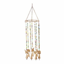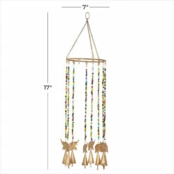 Brighten up your patio, lawn, or garden with this gold elephant wind chime. Nature’s own music sounds best when accompanied by the gentle tones of this outdoor accent piece that features gold elephant embellishments, gold cone-shaped wind catchers, and multi-colored glass beads. Add a twist to your eclectic themed home by using this accent decor that will surely create a delightful accessory for your outdoor space. This wind chime will extend a warm welcome to all your guests and can also make a great housewarming gift. This item comes shipped in one carton. Item features metal loop for easy and secure hang. Suitable for indoor use. Made in India. Eclectic theme.