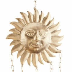 Hear the sun and the flowers sing with a soft breeze in this eclectic style gold metal surface windchime. This indoor or outdoor decor will subtly chime with the breeze in your garden, patio or near a window, and add a brilliant display with golden finish. The surface dangles on a metal chain as it supports the weight of the flowers cascading downwards with each piece dangling on a metal cable. Small bell chimes are attached at the ends to create their melodious song. Hang this piece and never miss out on a gentle breeze again in your eclectic style living space. This item comes shipped in one carton. Designed for safe and easy installation with metal chain and ring. Suitable for indoor use only. Made in India. Eclectic design.