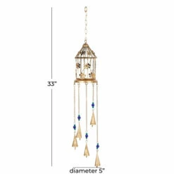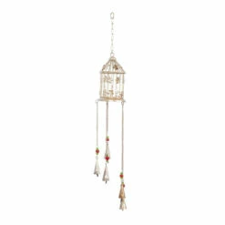 It is a great addition to your home decoration and will surely complement your existing furniture. A light and delicate piece to create a whimsical atmosphere anywhere in your home. Listen to the whistling of the wind with this windchime hanged on your eclectic-themed home space. This item comes shipped in one carton. Easily hang to nails or screws with its ring hook. Suitable for indoor and outdoor use. Made in India. Eclectic theme.. Eclectic design lets your personality shine in your home. This birdcage windchime is intricately crafted and designed with solid iron. It highlights a high gloss metallic gold overall finish and red and green accent finish. It flaunts bell windcatchers accented with beads and suspended from clover-detailed birdcage crown. It measures 5″W x 33″H and weighs 2 lbs.