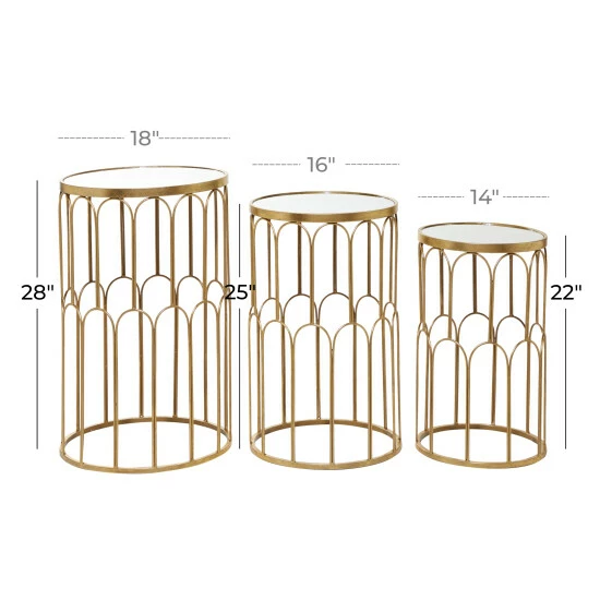 Use this metal and glass accent table set to display dรฉcor in a glam-style living room or entryway. Use it as an accent piece in the living room, library, bedroom, waiting areas, or hallways of you home. A compact friendly table providing you with additional storage space any where in your home. This item comes shipped in one carton. Trio features stylish mirrored table tops. Suitable for indoor use only. These metallic gold accent tables come as a set of 3. Glam inspired. Maximum weight limit is 100 lbs