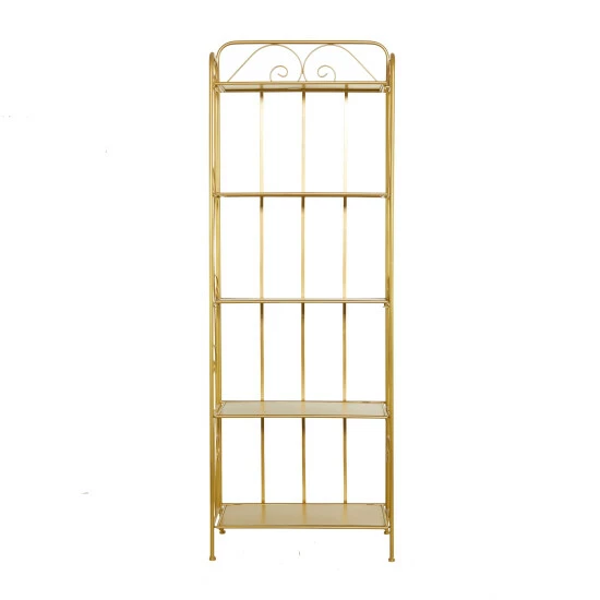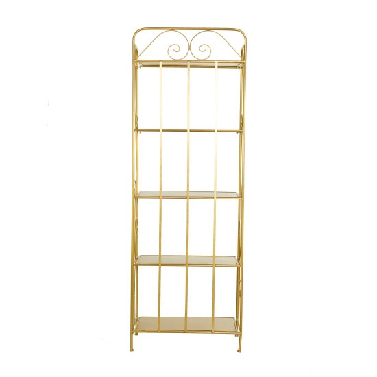 This romantic gold bakers rack is versatile for both indoor and outdoor display and can be used for showcasing your potted plants, decorative boxes, candles, sculptures, and books. Keep your home clutter free and utilize this space saving bakers rack for all your storage needs. A storage piece that is spacious to keep your valuable organized and safe anywhere in your home. Designed with rubber footing at the base that prevent scratching, anti tipping, as well as sliding around. This item comes shipped in one carton. Suitable for indoor and outdoor use. Avoid using abrasive cleaning pads or detergents, use a sponge with mild soap and warm water, then rinse with a garden hose. This bakers rack is made from solid iron construction with protective coating making it impervious to the elements with anti-corrosive property. This bakers rack features a 5 tier metal shelving unit. Glam style.