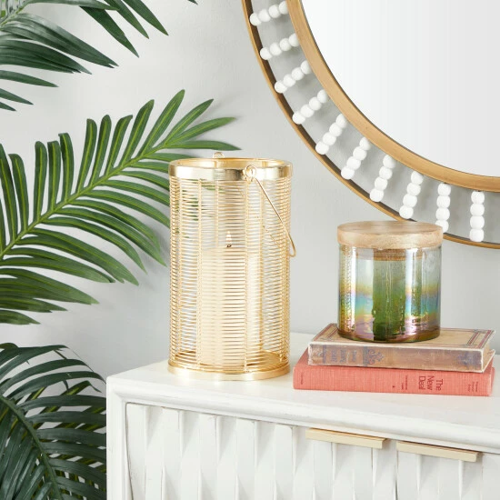 - This lantern decor highlights an overall crisp metallic gold finish emphasized on its glossy metal bands