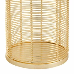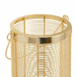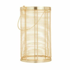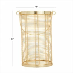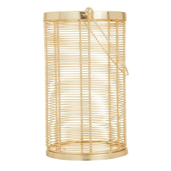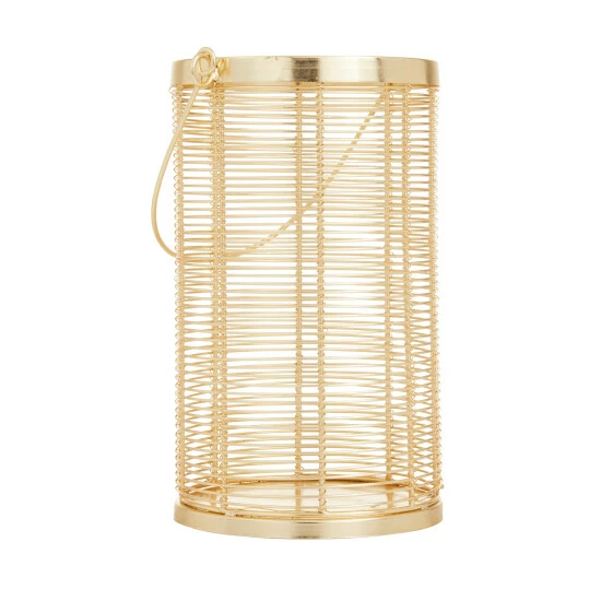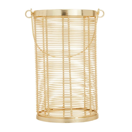 - Woven wicker inspired pattern metalwork outline this lantern decor with polished gold bands on its rim and base for added texture and character