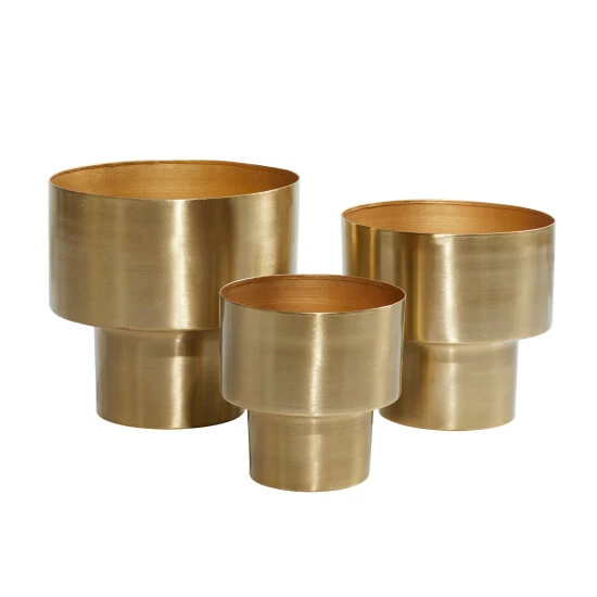 Use the variation in pot size and depth and stand height of this 2-in-1 set of gold indoor planters to furnish glam interiors. Completely iron, no-drainage hole pots, and flat round bases make up the solid construction to not disturb the calmness in the corner of your living space. Pots can be used as planters or as accent pieces together or separately. Use as plant holders or corner accent pieces in modern or contemporary interiors Wipe clean with a dry cloth. Suitable for indoor and outdoor use. Made in India. No drainage holes. Set includes 3 planters. Glam inspired. This item comes shipped in one carton.