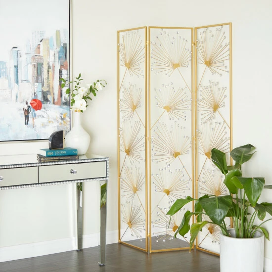 - This 3 panel room divider features a metallic gold finish and clear acrylic beads
