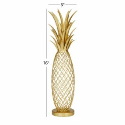 Adorn your kitchen or living room tabletops with this gold pineapple sculpture to add an eccentric and elegant vibe. This item will elevate any living space and bring some dimensions and texture into your living space. An artistic display to showcase your personality and enhance the look of any open table top space. This item comes shipped in one carton. Suitable for indoor use only. Glam design.. Elevate your surface space and add a touch of luxury with this glam inspired piece. This sculpture is crafted with iron for a solid and durable form. This table decor highlights a metallic gold overall finish. Delicate grid patterns on this table decor mimic the texture of a pineapple and spiked metalwork for its crown. This item measures 4″L x 5″W x 16″H and weighs 2 lbs