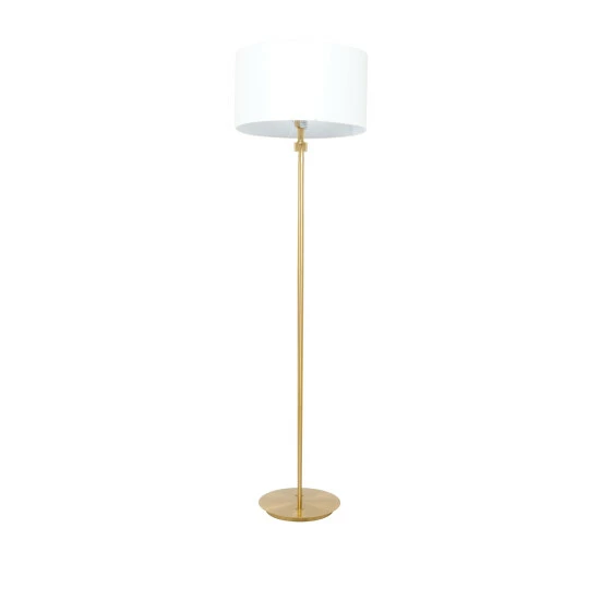 - This tall modern floor lamp features a white linen drum shade and a high polished gold iron body and base