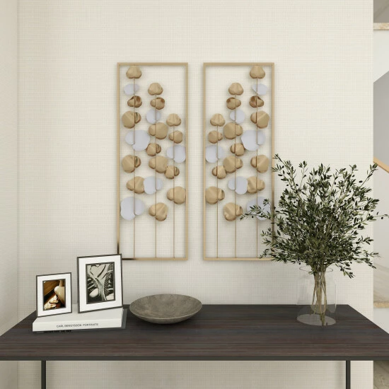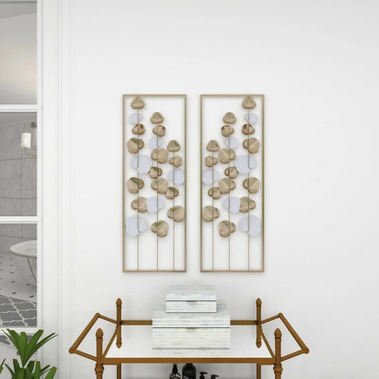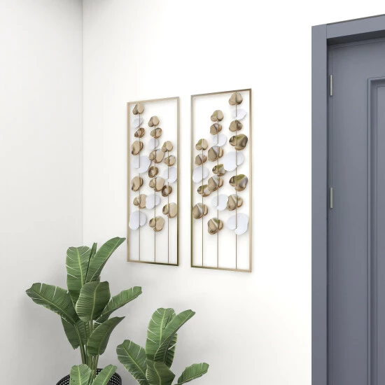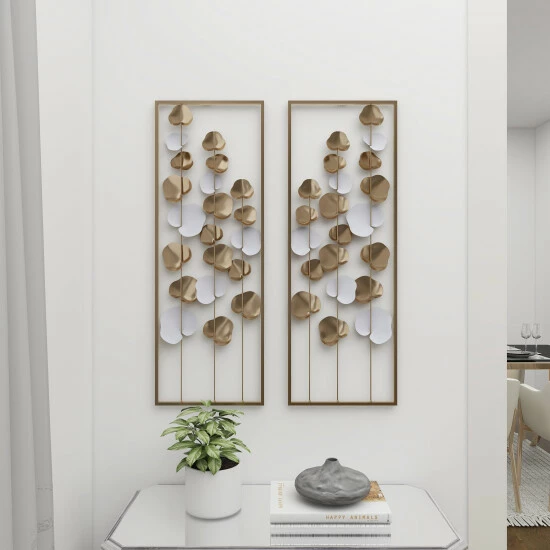 Transform your home into a stunning art gallery with this white and gold contemporary wall art decor. This metal wall art is inspired by floating leaves and beautifully finished in white and gold. The wall decor also has a muted gold metal frame that complements the whole aesthetic. Place on a dark wall to provide a stunning contrast or on a neutral wall to complement other gold-themed accents. Item is ready to hang by sawtooth hardware in the back. Suitable for indoor use only. Modern theme. This item comes shipped in one carton.