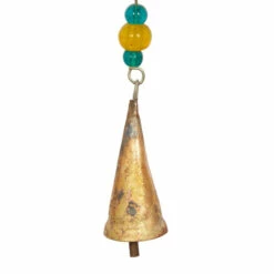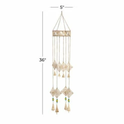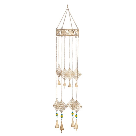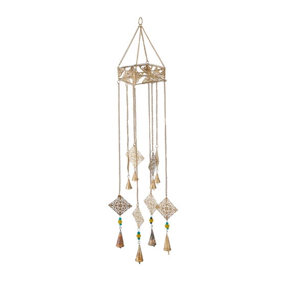 Decorate your patio with this delightful iron wind chime. The decor features diamond shapes with intricate patterns that pull in your gaze. Glass beads add to the aesthetic, and small bells chime when the wind blows. You can also hang this wind chime indoors for a dazzling addition to a bedroom. This item comes shipped in one carton. Designed for safe and easy installation with metal chain and ring. Suitable for indoor and outdoor use. Made in India. Traditional style.. Crafted in a traditional style that fits great in most homes. This windchime is made of solid metal for durable and long lasting use. Metal windchime showcases a semi shine gold finish with multi color beads. This whimsical windchime brings a soothing element into any space with its delicate and airy structure attached to a chain ring for convenient hang. This item measures 5″L x 5″W x 36″H and weighs 1 lb.