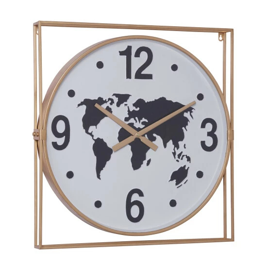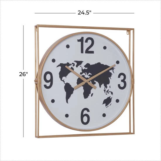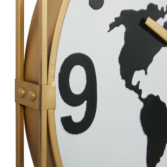 The colors of black and gold make up the simple yet modern design of this 100% iron wall clock. Such a color theme, the matching frame and hands, the huge numbers, and the world map as a focal point speak well that fewer elements are more. This wall clock’s dimensions are 24.5″L X 2.5″W X 26″H. It runs on one AA battery and hangs on a hook or screw via keyhole backings.