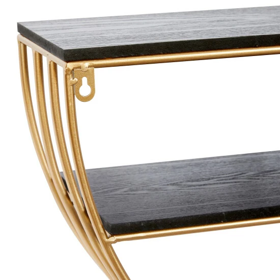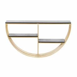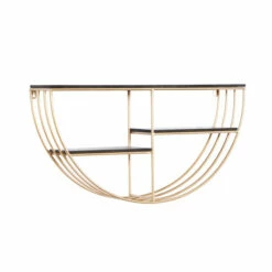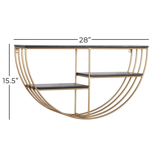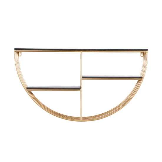 - This half round wall shelf highlights a metallic gold frame finish with black shelves finish