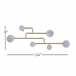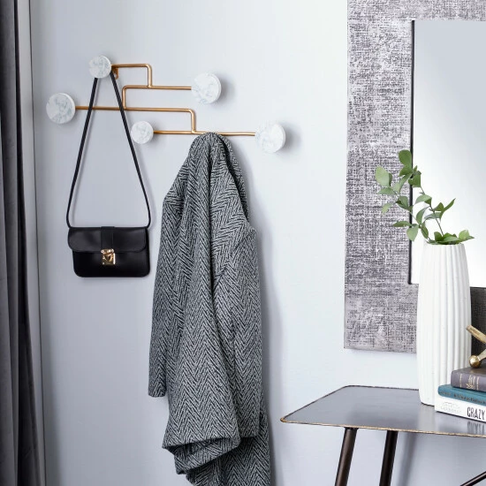 This wood and metal wall hook rack is both a home organizer to hang your bags and lightweight jackets, but also an abstract contemporary sculpture wall decor piece! The zigzag gold metal rack itself features 6 various-sized wooden circles that serve as wall hooks. Each wood circle has a marble-style finish with white and gray veining. Easily and securely hang this wall rack by the built-in metal keyhole hardware in the back for a sturdy (and stylish) display. Item is ready to hang by keyhole slots in the back. This item comes shipped in one carton. Each hook holds 5 to 8 lbs.
