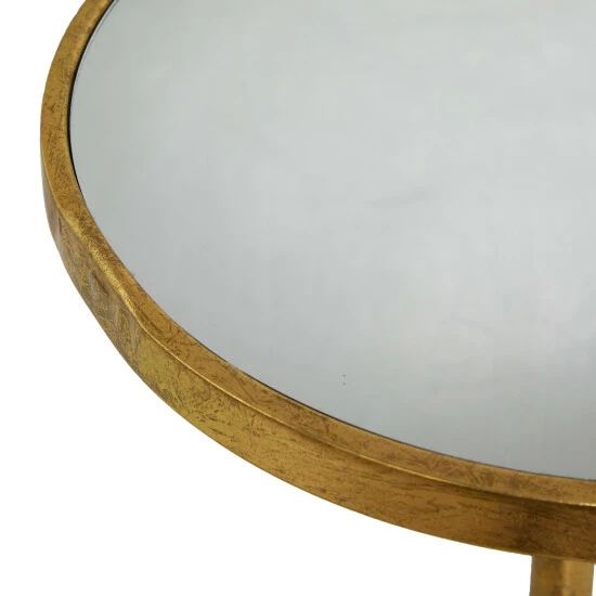 - Distressed gold finish highlights this accent table with clear mirror top