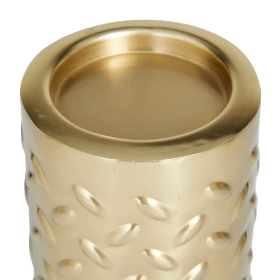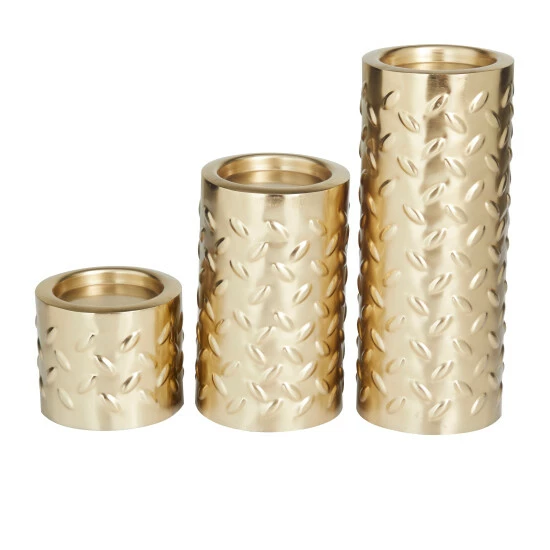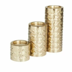 - A set of silver or gold candle holders featuring cylindrical structure in varying heights with round flat candle platforms and diamond plate patterns