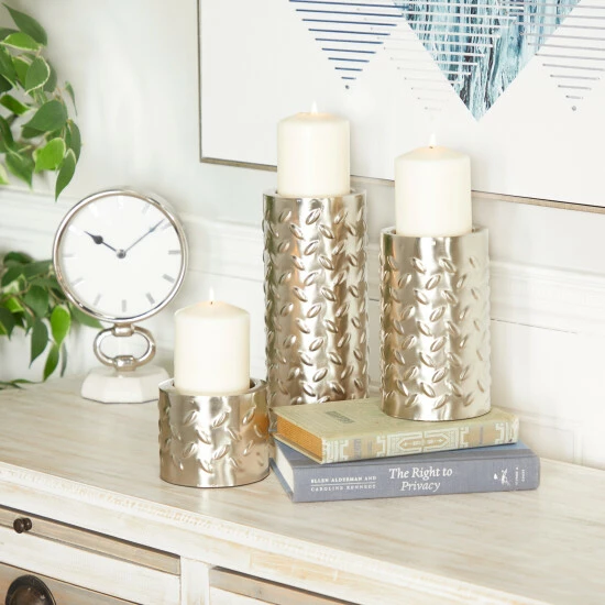 - This set of 3 pillar candle holders comes in a metallic silver and gold finish that suits any light-toned interior