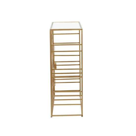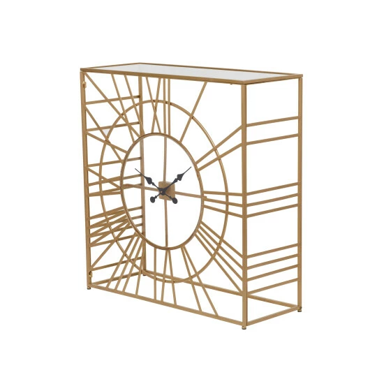 - This console table with clock highlights a gold finish that suits any contemporary setting