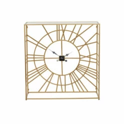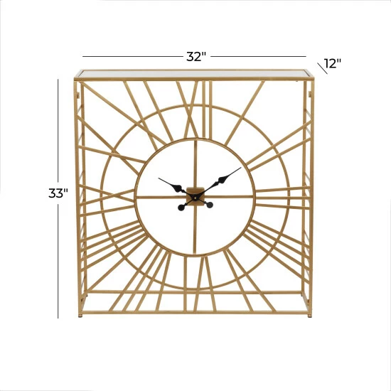 - A contemporary console table featuring a rectangular structure with glass top, large round clock with Roman numerals, and a minimalist open design