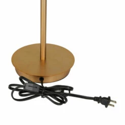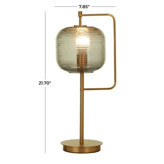 - A contemporary table lamp featuring an eye-pleasing black round ribbed glass shade supported by a gold slender metal frame with round base