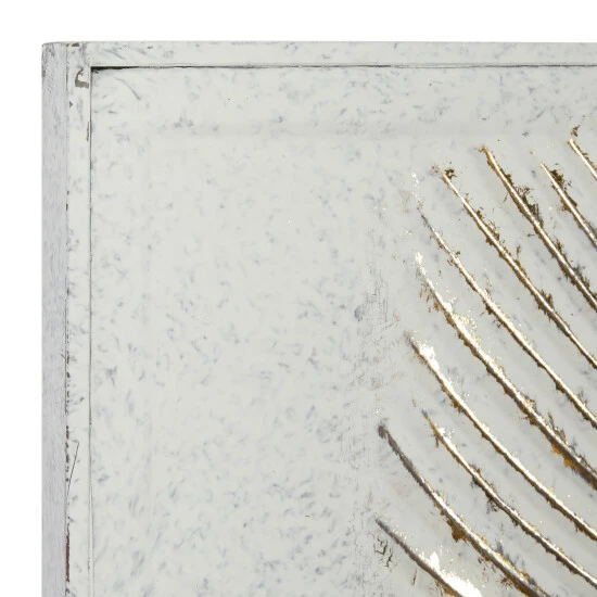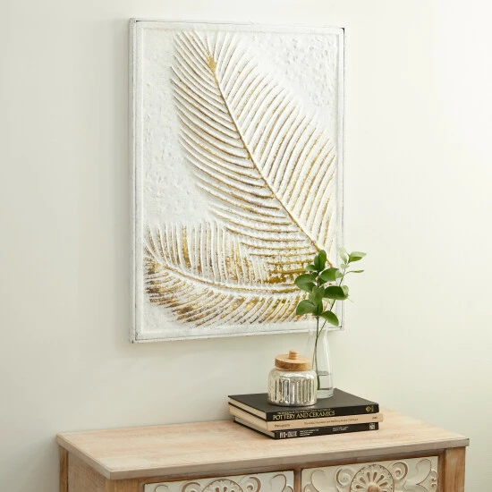 This large hammered metal wall decor panel boasts various textures and indentations to create a palm frond relief art piece. The lightweight iron is finished in a matte eggshell white color with distressing around high points to add depth and articulate the leaves’ details, revealing metallic gold. Easy and ready to hang, this large accent decor will work with any color palette or pattern!