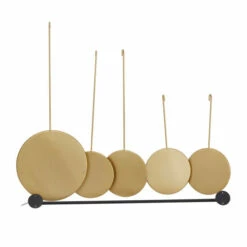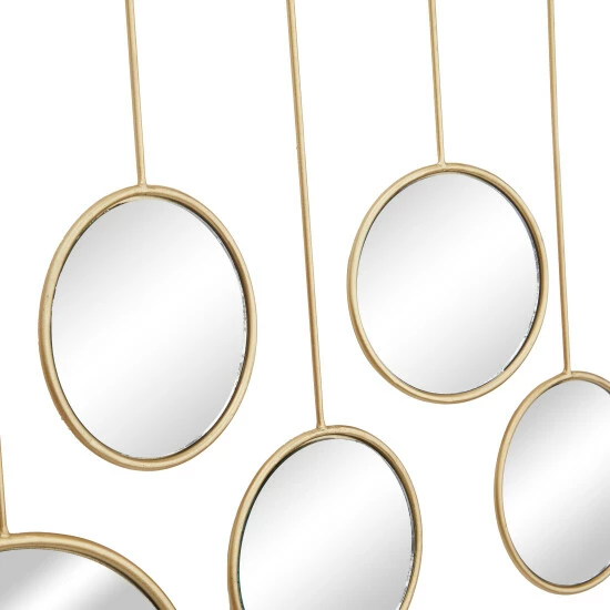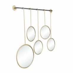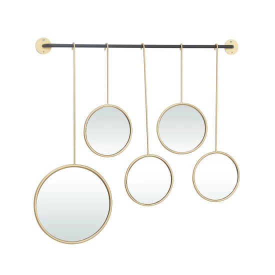 - Round gold mirrors hang from a projected rail in varied shapes for a chic and eccentric look