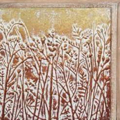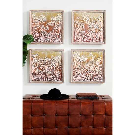 Dimensional metal wall decor set with embossed copper and gold-colored metal squares with floral and botanical designs. The very textural metallic distressed finish adds depth and the natural beige wood frames with whitewash finishes add an earthy touch. This set of 4 square metal and wood wall art pieces make a lovely set together or can be separated into standalone botanical wall decor.